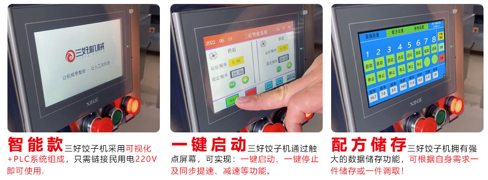 部分機型采用PLC系統(tǒng),不堆皮,不斷皮,壓面均勻,餡料與面皮可分別控制也可同步控制,安全可靠;