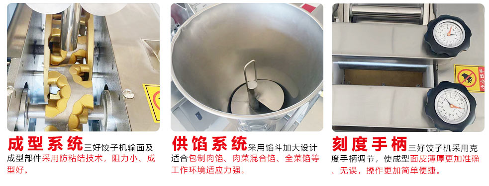 制作好面坯和拌好的餡料放入機器的餡斗和面斗,通過刻度手柄可以調(diào)節(jié)皮的厚薄,微電腦數(shù)控系統(tǒng)調(diào)節(jié)餡料多少,將面和餡傳送至成型機頭即可出餃子