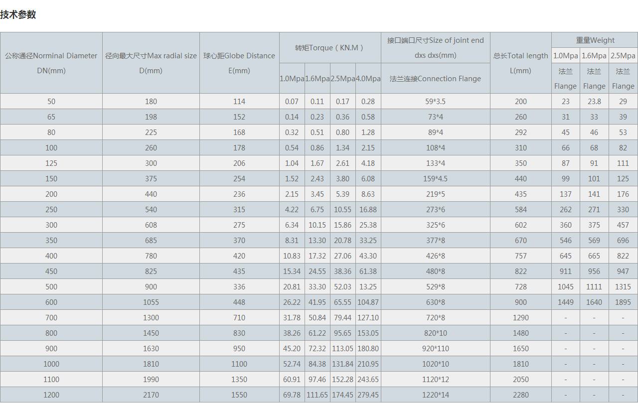 公稱通徑Norminal Diameter DN(mm) 徑向很大尺寸Max radial size D(mm) 球心距Globe Distance E(mm) 轉矩Torque(KN.M) 接口端口尺寸Size of joint end dxs dxs(mm) 總長Total length L(mm)  重量Weight