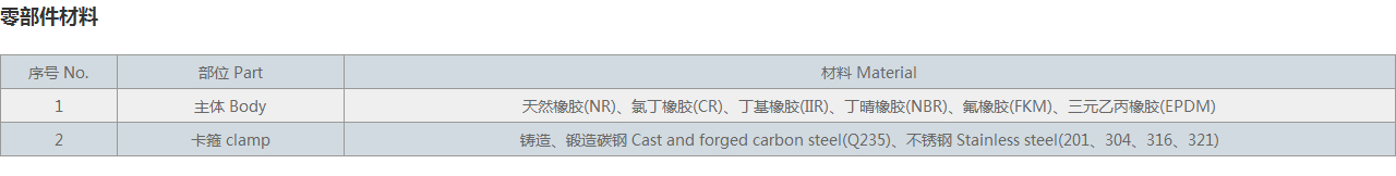 1 主體 Body 天然橡膠(NR)、氯丁橡膠(CR)、丁基橡膠(IIR)、丁晴橡膠(NBR)、氟橡膠(FKM)、三元乙丙橡膠(EPDM)