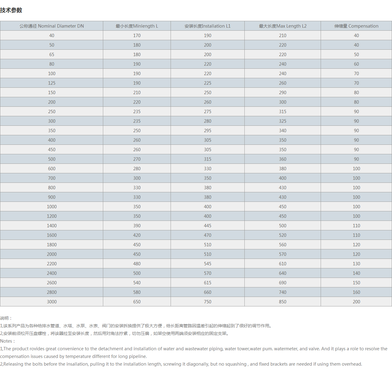 公稱通徑 Nominal Diameter DN 很小長度Minlength L 安裝長度Installation L1 很大長度Max Length L2 伸縮量 Compensation