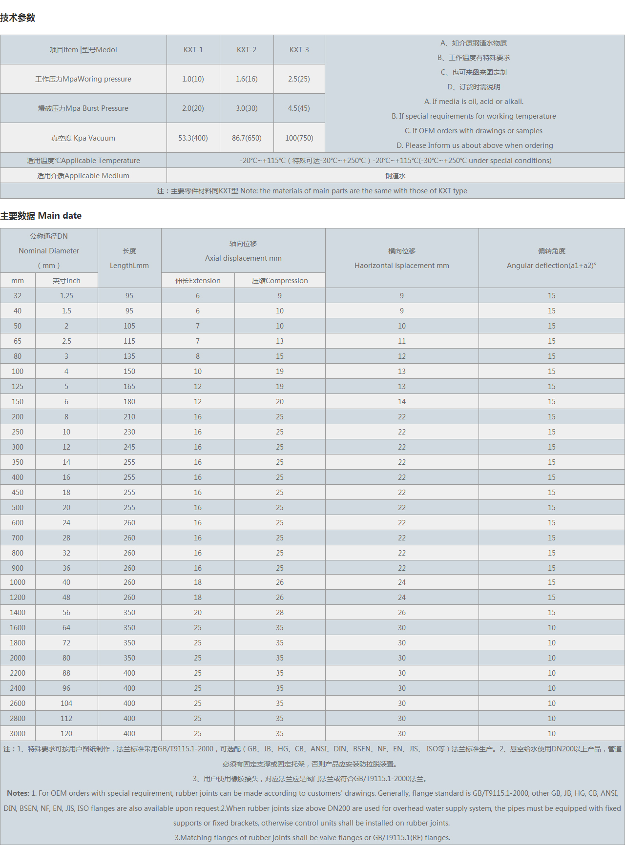 | 注:1、特殊要求可按用戶圖紙制作,可選配(GB、JB、HG、CB、ANSI、DIN、BSEN、NF、EN、JIS、 等)法蘭標準生產。2、懸空給水使用DN200以上產品,管道必須有固定支撐或固定托架,否則產品應安裝防拉脫裝置。 3、用戶使用橡膠接頭,對應法蘭應是閥門法蘭。 Notes:1. For OEM orders with special requirement, rubber joints can be made according to customers' drawings. Generally, flange standard is, other GB, JB, HG, CB, ANSI, DIN, BSEN, NF, EN, JIS, flanges are also available upon request.2.When rubber joints size above DN200 are used for overhead water supply system, the pipes must be equipped with fixed supports or fixed brackets, otherwise control units shall be installed on rubber joints. 3.Matching flanges of rubber joints shall be valve flanges or flanges. |