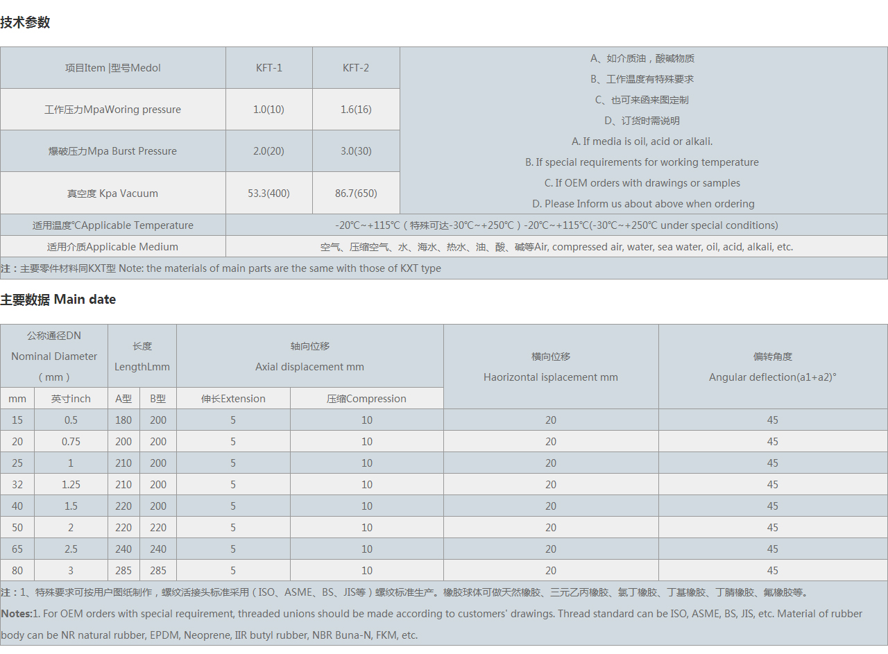 Notes:1. For OEM orders with special requirement, threaded unions should be made according to customers' drawings. Thread standard can be , ASME, BS, JIS, etc. Material of rubber body can be NR natural rubber, EPDM, Neoprene, IIR butyl rubber, NBR Buna-N, FKM, etc.